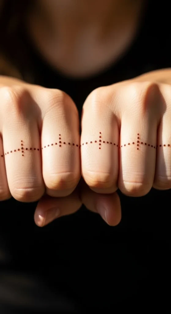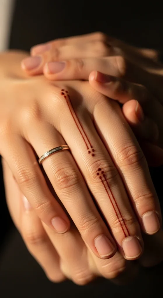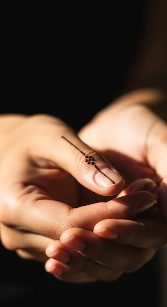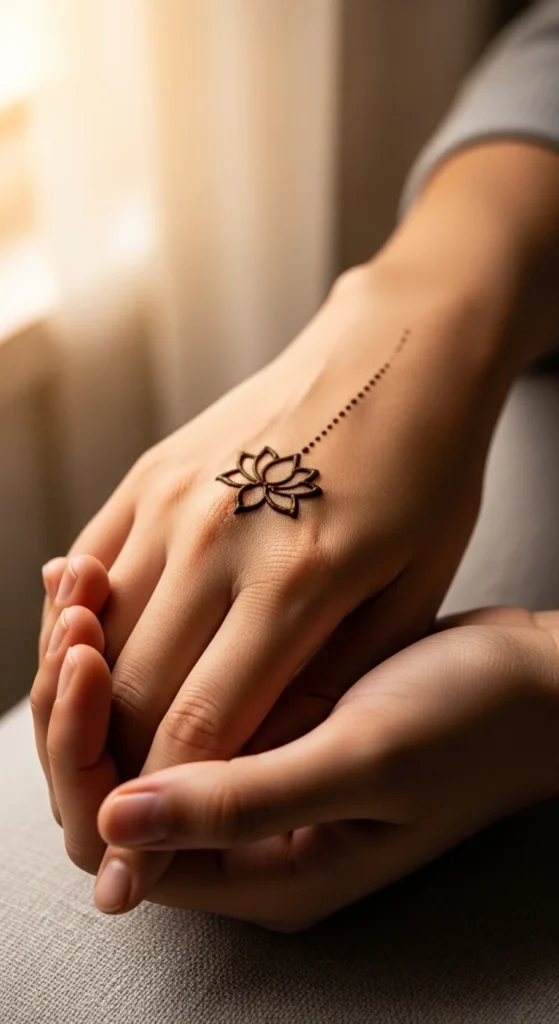 A diagonal dot-and-line chain looks modern and structured. Start near the base of the index finger and angle the chain down toward the outer side of the hand. Use short thin line segments with tiny dots between them, like a delicate chain. Keep the chain narrow and avoid adding extra motifs around it. This design looks especially good in photos because the diagonal line adds shape and flow. It also feels classy because it’s clean and controlled. If you want balance, add a tiny dot trio near the wrist on the same diagonal line, then stop.