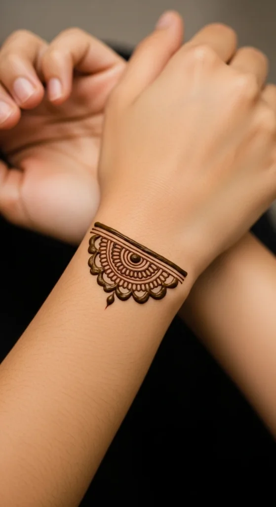 A slim bracelet line is one of the cleanest minimal mehndi looks. Draw a thin band around the wrist. Add evenly spaced dots along the band or place a tiny dot trio at the center like a charm. The band should look light, not thick. This style works beautifully when you’re wearing sleeves that show the wrist area. It also complements watches and bangles because it feels like an extra accessory, not a full design. Keep the dots consistent in size so the band looks neat. If you want more detail, add one small leaf cluster at one side, but keep it tiny. The overall look stays modern, simple, and elegant.