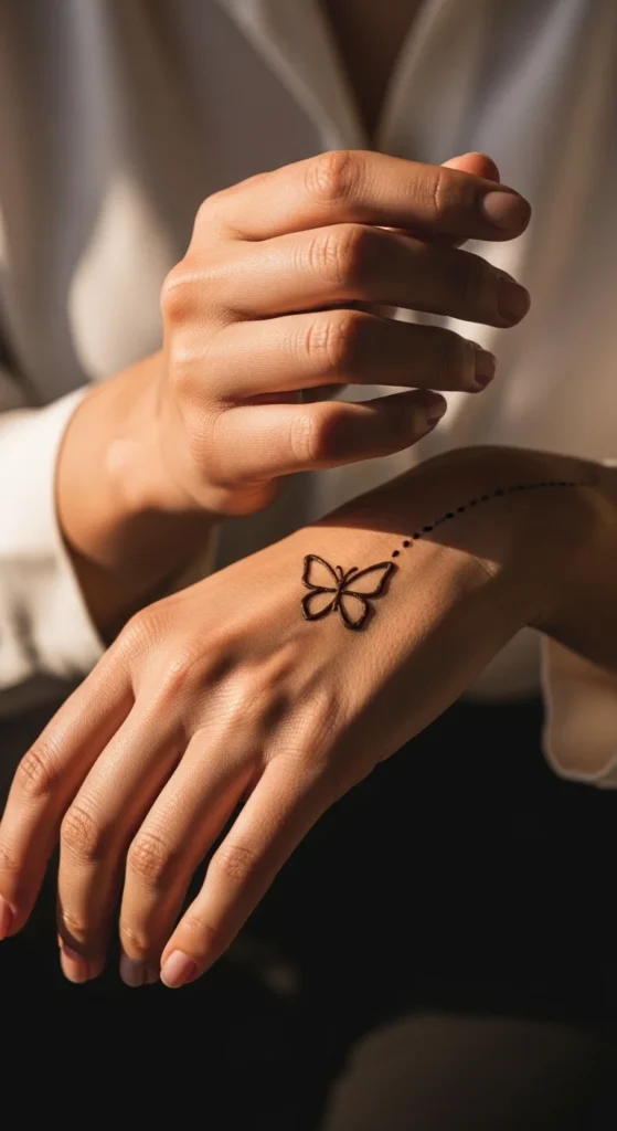 A tiny butterfly outline can look classy when it’s kept simple and small. Place it near the wrist or slightly off-center on the back of the hand. Draw a clean outline with two small wings and a tiny body. Skip heavy patterns inside the wings. A single outline is enough to make it look modern. If you want a small finishing touch, add one tiny dot near the butterfly, not a full trail. Keep the butterfly compact so it feels like a fine detail, not a big statement.