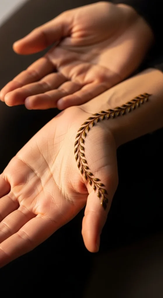Side-palm mehndi looks stylish because it shows when you move your hand, but stays subtle when your hand is resting. Draw a thin line along the outer edge of the palm, starting at the wrist and moving up toward the pinky side. Add tiny leaves angled inward. Keep the leaf spacing open so the line stays light. This design looks especially nice in candid photos because it appears as a soft detail rather than a full pattern. It also feels modern because the placement is unexpected. If you want a clean ending, finish with two tiny dots near the wrist. Keep everything thin and minimal, and avoid turning it into a full border.