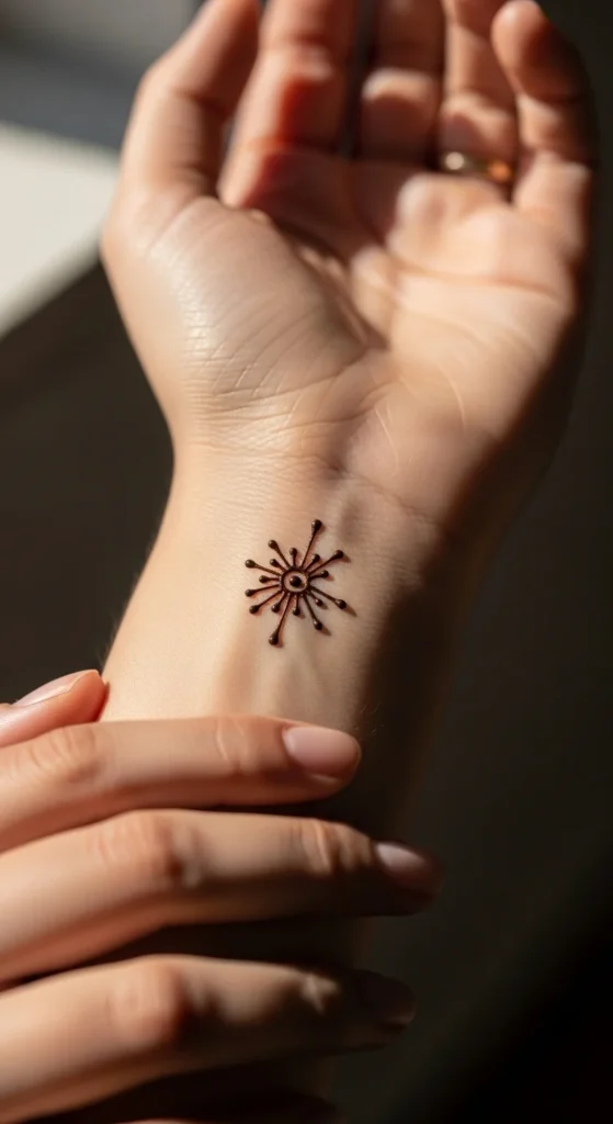 A tiny starburst is a clean, trendy detail that feels almost tattoo-like. Place a small dot on the wrist and draw short thin rays around it. Keep the rays light and slightly uneven for a natural look. This works well when you want something minimal but still noticeable. It also pairs nicely with bangles because it sits in a small area and doesn’t crowd the arm. To keep it classy, avoid making the rays too long or too thick. If you want a bit more style, add two micro dots on one side of the starburst. The final look stays simple, modern, and easy to wear.