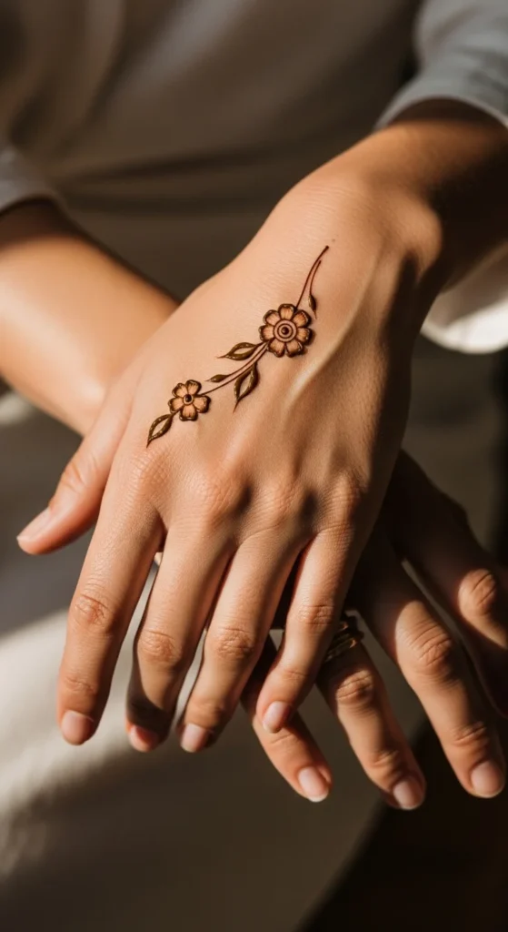A single floral sprig is a timeless minimal design that still feels festive. Place a small flower near the base of the index finger or slightly off-center on the back of the hand. Add a thin stem and two small leaves. Keep the petals simple—just outlines with a small center dot. This looks classy because it uses one motif and lets it breathe. If you want the sprig to feel more modern, keep the flower small and the stem thin, with more space around it. You can also angle the sprig diagonally for a softer, more natural flow. Pair it with simple rings for a clean, styled look.