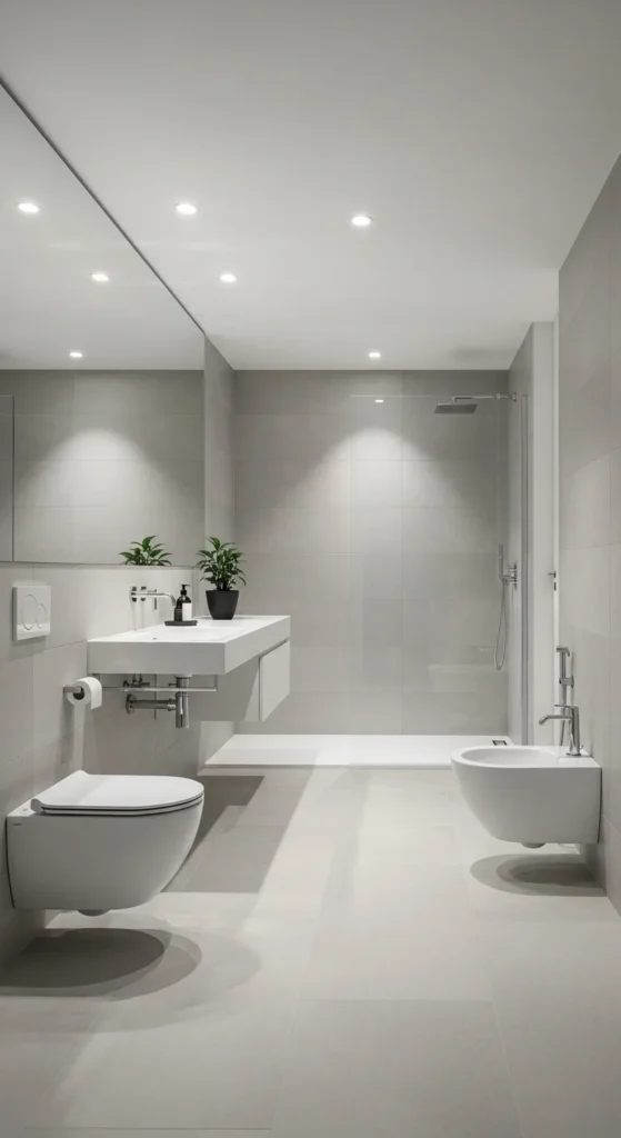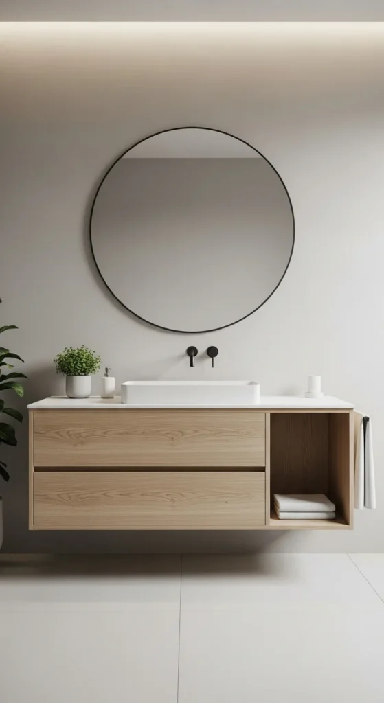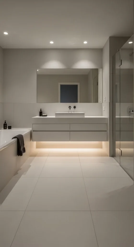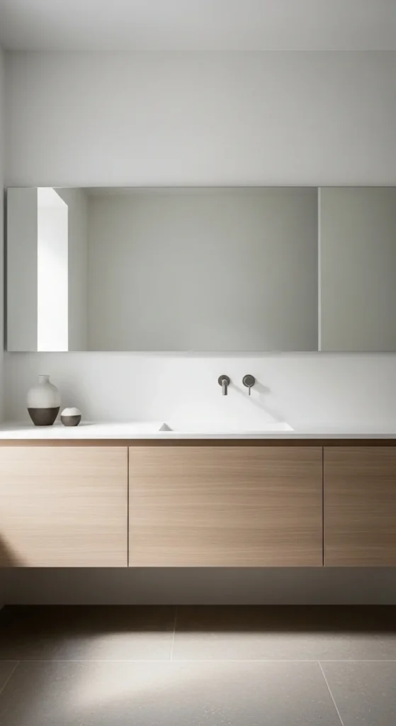 Minimalism values open space as much as objects. Keeping the floor clear improves visual flow. Floating vanities and wall-mounted fixtures support this goal. Avoid unnecessary furniture or baskets on the floor. More visible floor creates a calmer room.