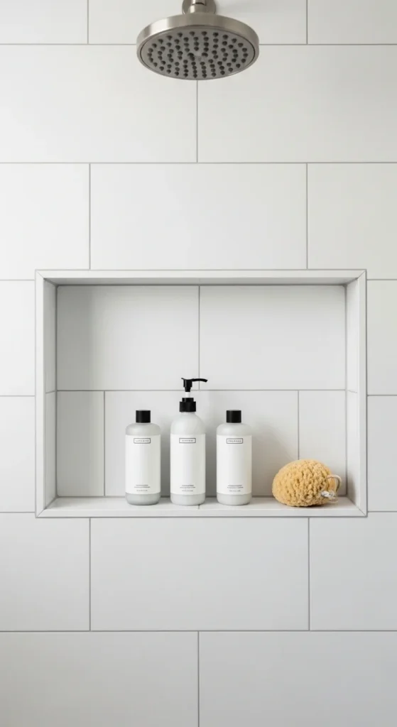 Recessed niches store products without protruding into the space. They keep walls flat and organized. Match the niche tile to the surrounding wall for subtlety. DIY kits make this achievable during small updates.