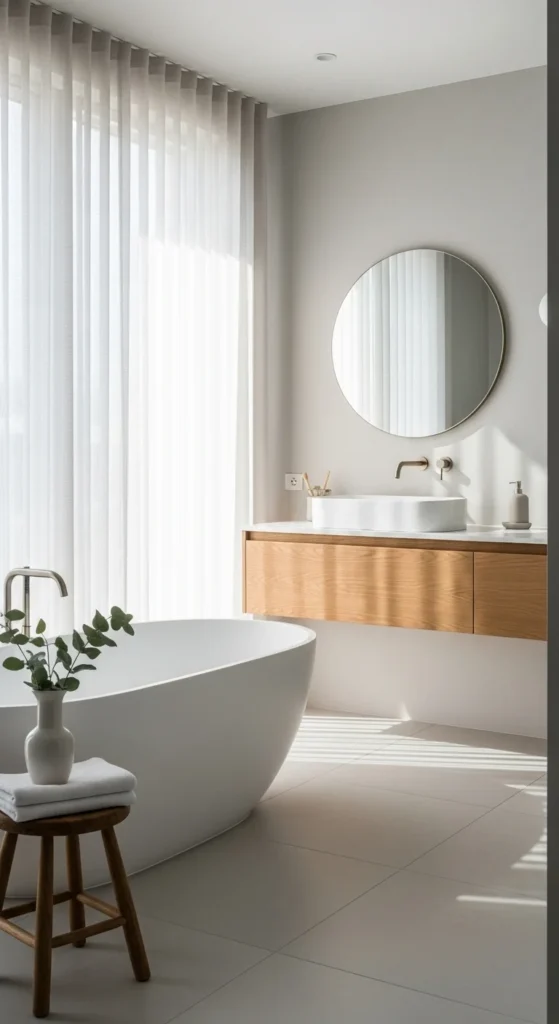Natural light supports a calm bathroom more than any decor item. It softens edges and brings out gentle surface textures. Keep window coverings simple and light so daylight can pass through. Sheer cotton or linen panels work well for privacy without blocking brightness. If the bathroom has limited windows, focus on reflective surfaces like light tiles and pale walls. Avoid heavy blinds or dark frames that break the flow of light. For an affordable improvement, clean windows regularly and trim back outdoor plants blocking sunlight. Even small changes improve brightness. A well-lit bathroom feels easier to use and visually lighter throughout the day.