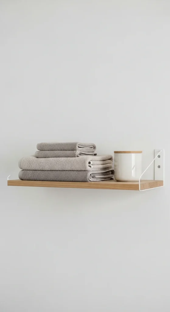 Open shelves fit minimalist bathrooms when used with restraint. One shelf is often enough. Two at most. Limit items to daily essentials so the shelf supports function, not display. Matching containers help maintain order. Leave visible empty space around objects so the shelf feels intentional. For a low-cost DIY, install a slim wood or painted shelf with hidden brackets. Avoid thick boards or decorative supports. The goal is quiet utility. When shelves stay uncluttered, they add storage without visual stress. This makes the bathroom easier to clean and easier to look at.
