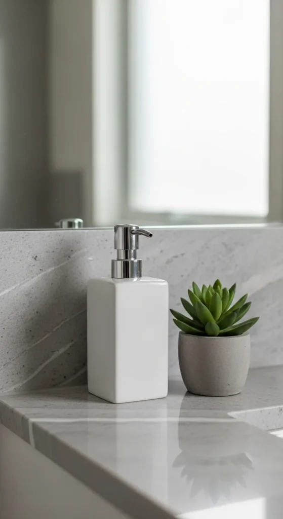 Minimalist bathrooms rely on fewer objects, not decorative layers. Choose accessories that serve a clear purpose. A soap dispenser. A toothbrush cup. That may be enough. Skip novelty items and extras that collect dust. When selecting accessories, look for simple shapes and neutral finishes. Ceramic, stone, or glass work well. For a budget approach, remove items first before buying anything new. Often the room improves immediately. Fewer objects mean faster cleaning and calmer visuals. This habit supports long-term simplicity, not constant rearranging.