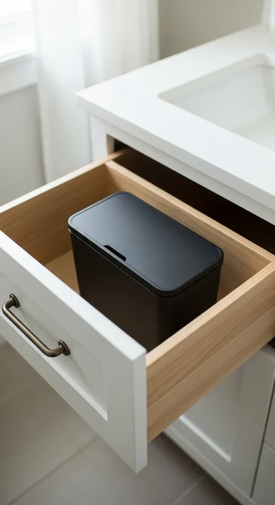 Visible trash breaks the calm of a minimalist bathroom. Concealed storage keeps the room visually quiet. Use under-sink bins, pull-out drawer systems, or small lidded containers hidden inside cabinets. Many organizers fit standard vanities and cost very little. If space is limited, mount a slim bin on the inside of a cabinet door. This small change removes daily clutter from sight. When the eye does not land on waste bins, the room feels cleaner and more intentional.