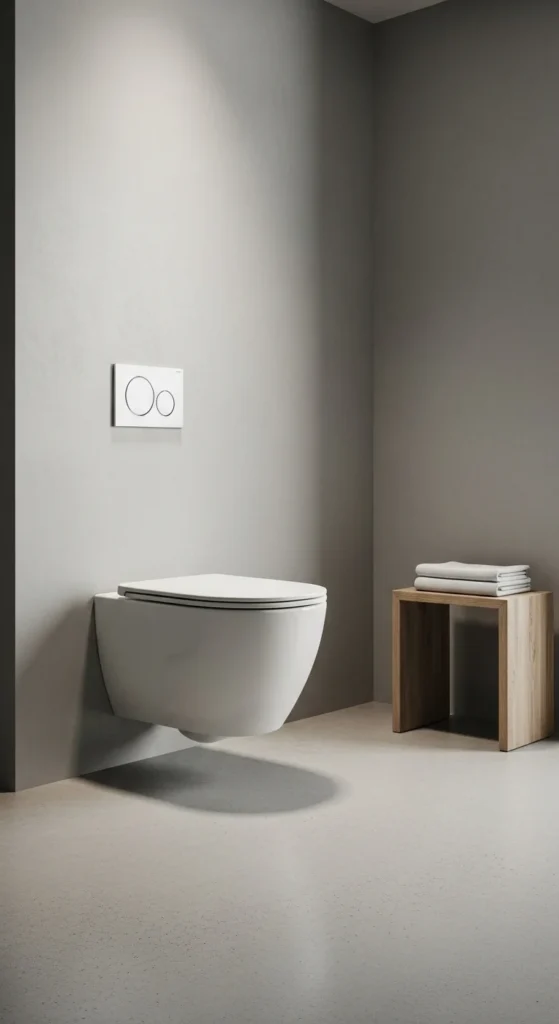 Wall-hung toilets open up floor space and simplify cleaning. The exposed floor creates a lighter visual footprint. This supports a clean, modern look. If replacing the toilet is not realistic, choose a compact floor-mounted model with simple lines. Keep the surrounding area free of decor. Clear space around fixtures helps the bathroom feel less crowded and easier to maintain.