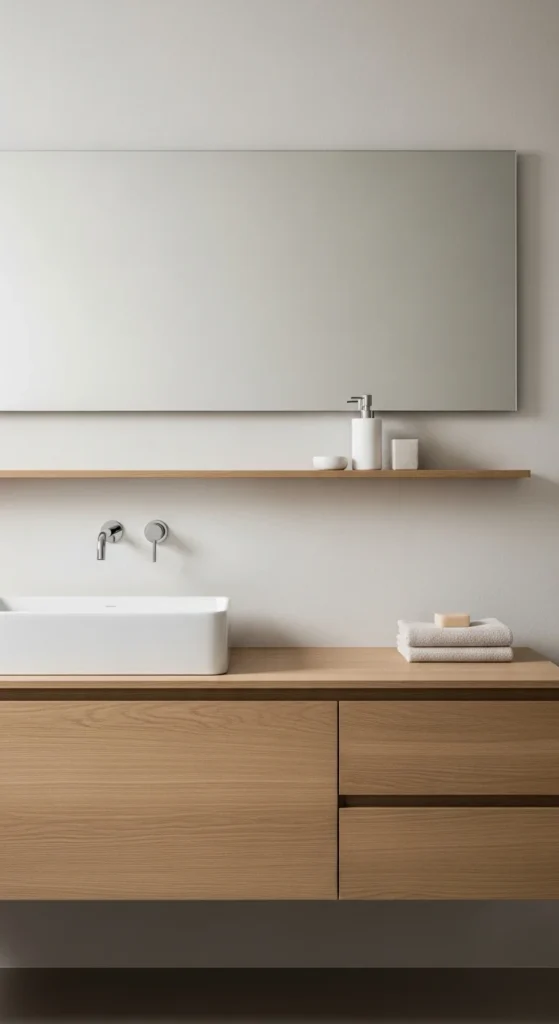 Wood adds warmth without breaking minimalist principles. Use light wood tones with smooth finishes. Limit wood to one or two elements such as a vanity or shelf. This keeps the look clean and grounded. For a budget update, add a wood tray or shelf instead of replacing furniture. Natural texture paired with neutral colors creates quiet comfort.