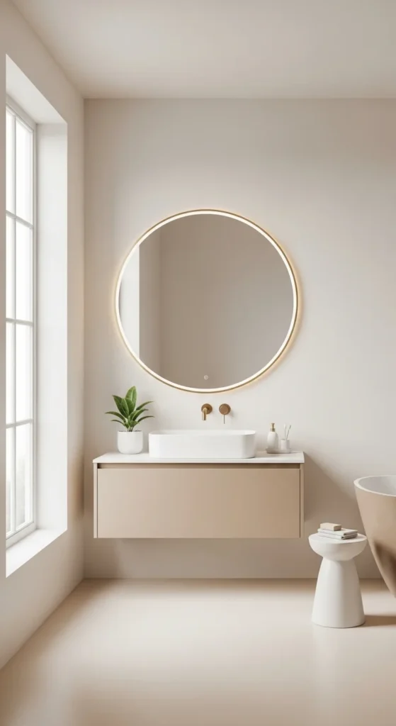 Minimalist bathrooms rely on calm color families. Soft white, beige, and light gray keep the space quiet. Using similar tones on walls, trim, and ceilings removes harsh breaks. Paint is one of the lowest-cost updates available. Keeping the palette limited makes every other choice easier and reduces visual stress.