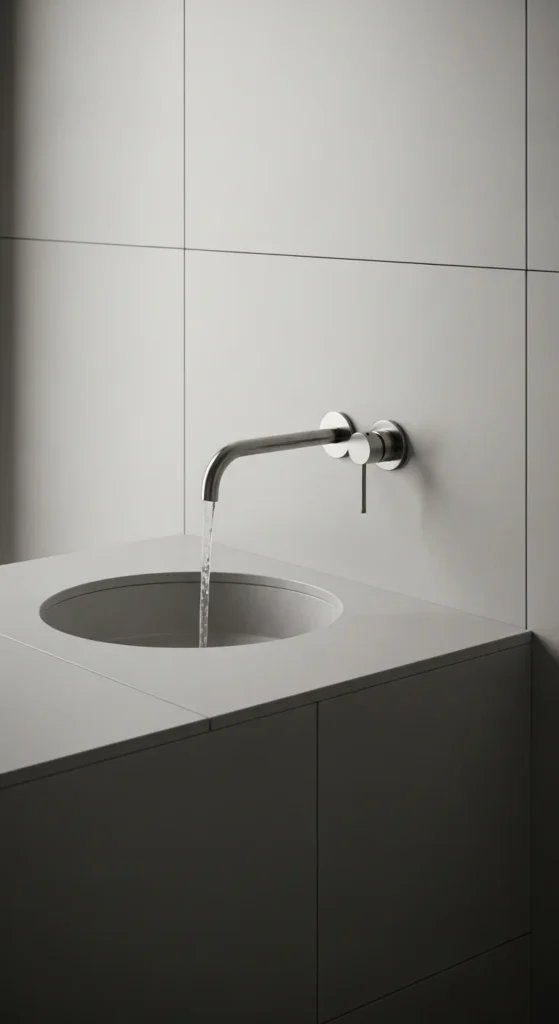 Wall-mounted faucets free up counter space and reduce visual complexity. The sink area feels more open and easier to clean. If plumbing changes are not realistic, choose a slim single-hole faucet. Keeping hardware minimal supports a clean, calm environment.