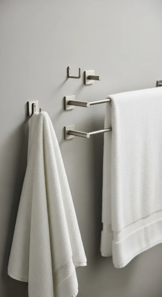 Textiles add softness without clutter when colors stay restrained. Stick to white, beige, or light gray towels. Mix textures instead of colors for interest. Waffle, ribbed, or smooth cotton create variety without visual noise. Replace only hand towels first if budget is tight. They are the most visible items. Keep extras stored away so shelves and counters stay clear. Neutral textiles help the bathroom feel calm even when used daily.