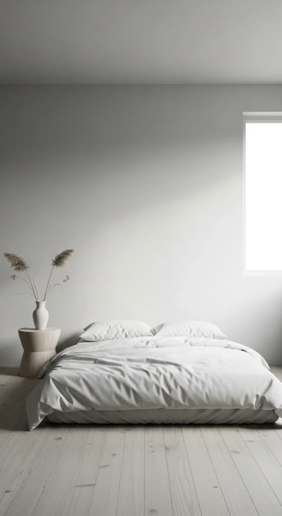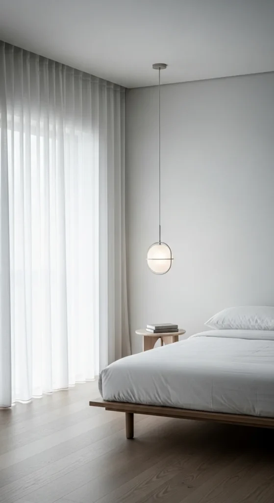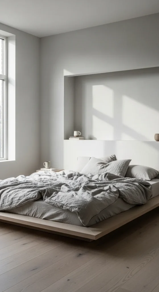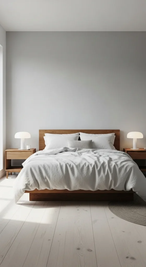 Minimalism works best when one element anchors the room. Let the bed be that focus. Choose a frame with clean lines or a subtle sculptural shape. Skip busy headboards or bold wall art above it. Keep bedding simple with one duvet and two pillows. This keeps attention centered and the room feeling balanced.