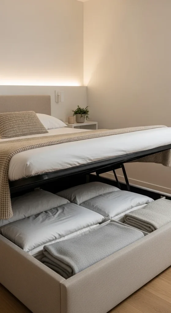 Hidden storage helps maintain a calm bedroom. An ottoman bed lifts from the base to reveal a large storage compartment underneath the mattress. This is a great place to store extra bedding, seasonal clothes, or spare pillows without adding dressers or bins to the room. Choose a design with clean lines and neutral upholstery so it fits the minimalist look. Keep stored items in soft fabric bags or simple boxes so the inside stays organized. If an ottoman bed isn’t possible, use shallow storage containers under a standard bed instead. Keeping items out of sight makes surfaces easier to keep clear, which helps the room feel lighter and more restful.