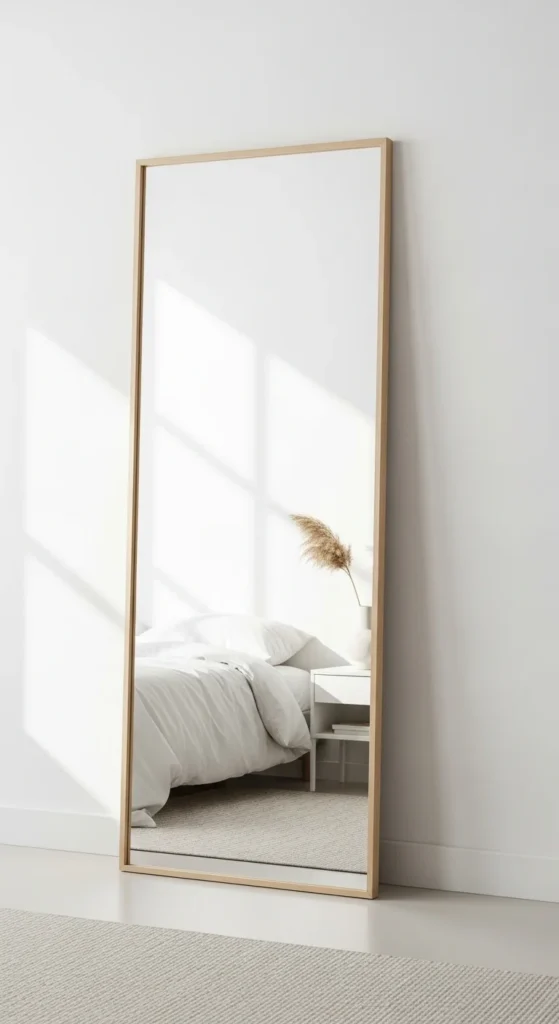 A large mirror reflects both light and open space, helping the room feel brighter and less closed in. Leaning a tall mirror against the wall gives a relaxed, modern feel and avoids the need for drilling. Position it across from a window if possible so natural light bounces deeper into the room. Choose a thin frame in wood, black metal, or no frame at all for a clean look. Avoid placing it where it reflects clutter, since that doubles visual mess. This simple addition makes the bedroom feel more open while also being practical for getting dressed.
