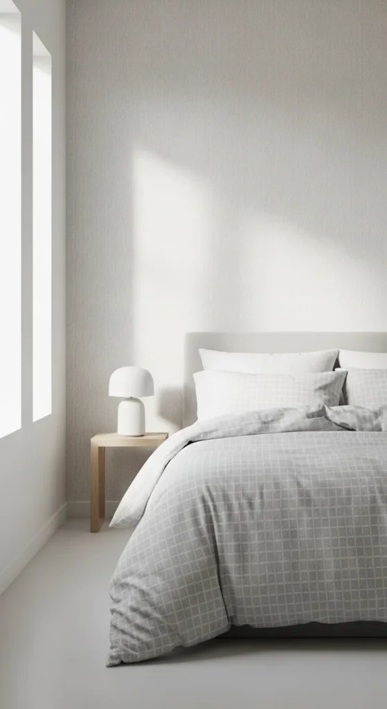 Patterns can work in minimalist rooms when they stay within the same color family. Tonal pattern drenching means using subtle prints in similar shades so nothing feels loud. Think soft striped bedding in beige tones or a faint geometric wallpaper in warm gray. Because contrast stays low, the room feels layered but still peaceful. DIY stenciling in a close paint shade can also create this effect on a budget.