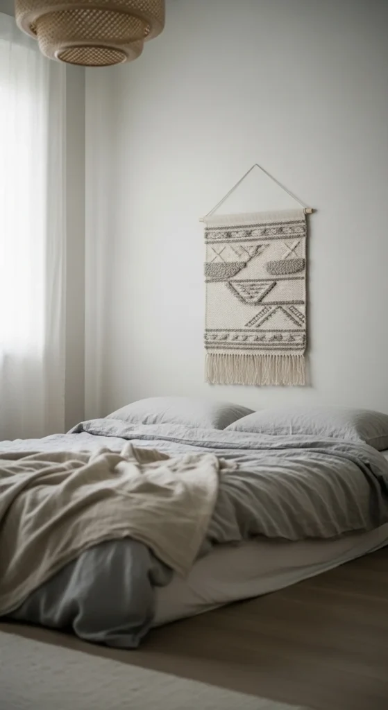Instead of bold framed art, try a small woven wall hanging in cotton, wool, or jute. Fiber art adds texture and warmth without strong color or shine. Choose a piece in soft neutral tones and keep the size modest so the wall still feels open. You can even make your own using rope or yarn and a wooden dowel.