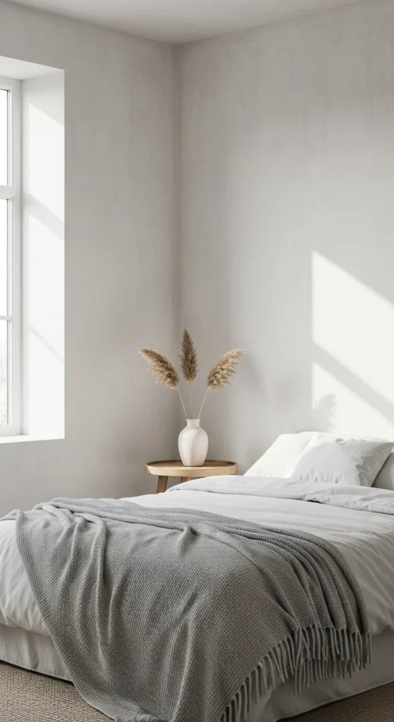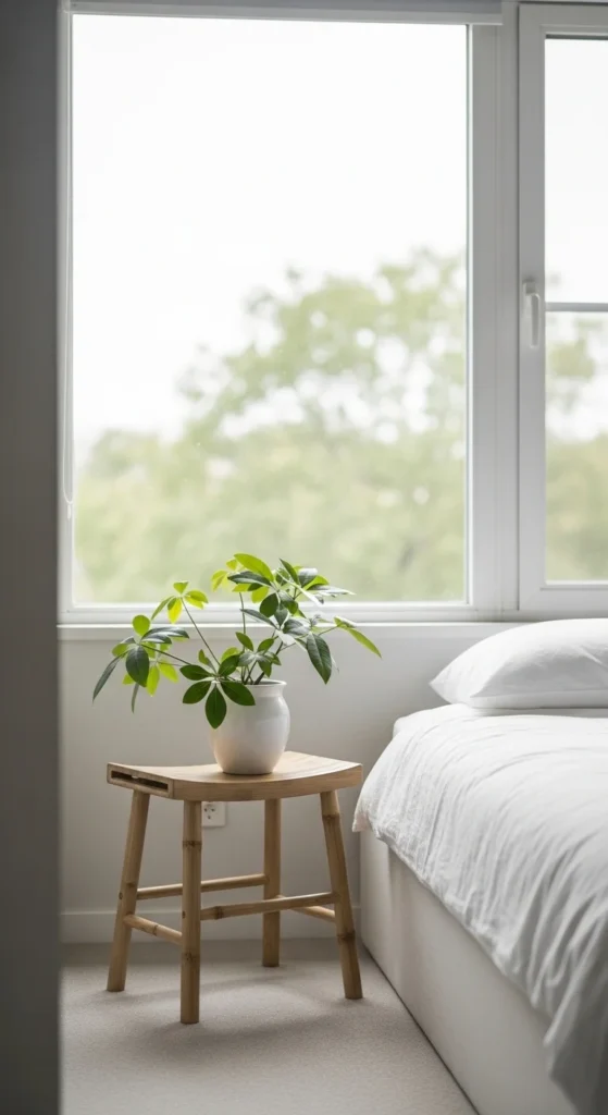 Natural accents help a minimalist room feel warm instead of stark. A bamboo stool, woven basket, or small potted plant introduces organic texture. Stick to one or two pieces so the space stays simple. If you don’t want plant care, try dried grasses in a plain vase.