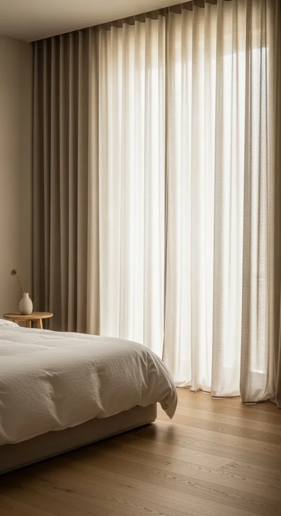 Linen curtains soften incoming light and add gentle movement to the room. Choose floor-length panels in white, beige, or light gray. Hang them close to the ceiling to make the walls look taller. Linen’s natural texture adds depth without heavy color or pattern.