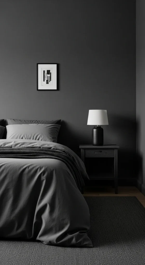 Minimalism doesn’t have to mean all white. A small section in deep charcoal or warm brown can feel cozy and grounded. Keep the rest of the room light so the darker area feels intentional and calm rather than heavy.