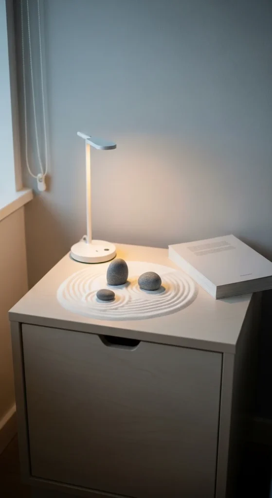 A tiny sand garden with a few stones adds a quiet ritual to your space. Choose a small tray and keep the design simple. This works as both decor and a calming hands-on moment before bed.