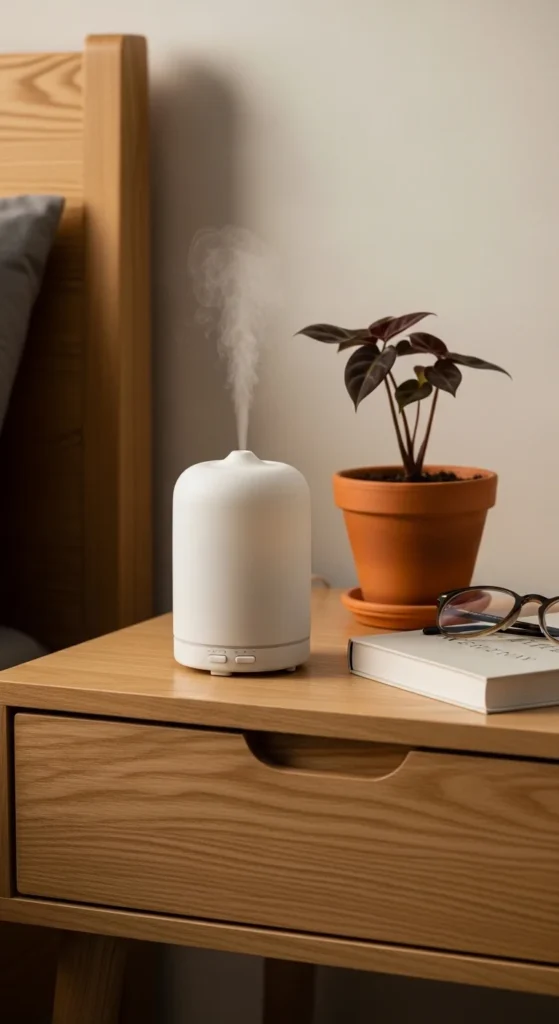Scent influences how a room feels. A small diffuser with lavender or chamomile oil adds a gentle calming aroma. Choose a simple ceramic or glass diffuser that blends into the decor. Keep scents light so the atmosphere stays peaceful.