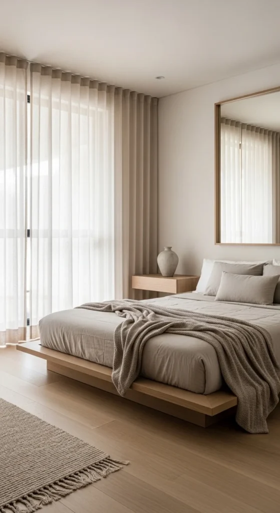 A low-profile bed makes the room feel grounded and open at the same time. When furniture sits lower, ceilings appear taller and the room feels less crowded. Choose a simple platform frame with clean lines and no bulky headboard. Light wood or upholstered frames in neutral fabric work well. Pair it with breathable linen bedding in soft, muted tones. Skip heavy bed skirts or ornate details that add visual weight. If you’re on a budget, wooden pallets sanded and sealed can create a similar look. Keep the area under the bed tidy or use shallow storage bins in matching colors. This simple furniture choice sets the tone for a calm, uncluttered bedroom without needing extra decor.