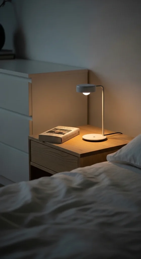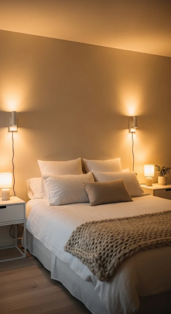 Harsh ceiling lights make a bedroom feel clinical. Use soft lighting instead. Wall sconces, plug-in pendants, or small lamps with warm bulbs create a relaxed glow. Add a dimmer if possible. This layered lighting helps the room feel cozy at night.