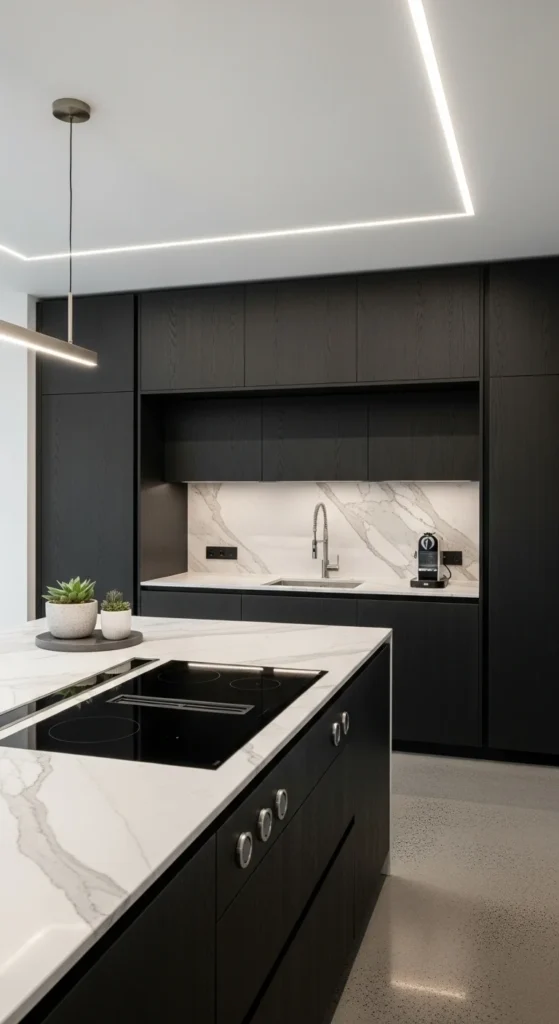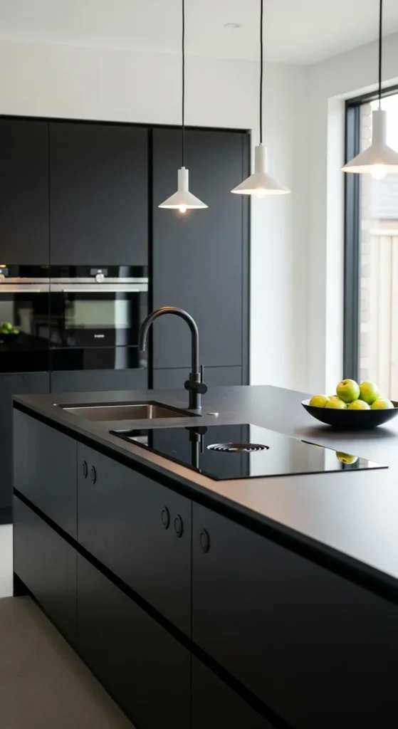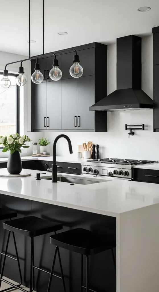 Black accents ground light kitchens. Faucets, lights, or stools add contrast. Stick to one shade of black to avoid visual noise. Matte finishes feel softer.