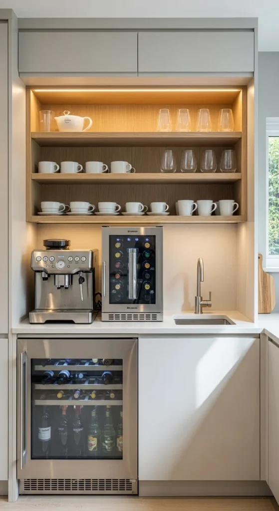 Beverage stations organize daily routines. Use a small cabinet zone for coffee or drinks. Keep shelves simple and containers neutral. This area feels intentional without spreading clutter.