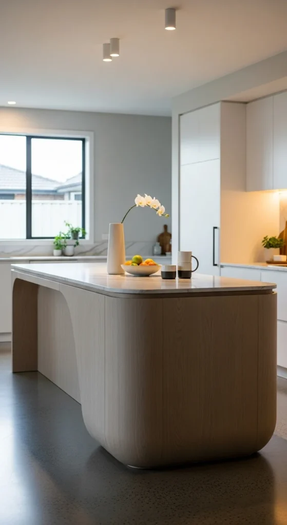 Curves soften strict layouts. Rounded island corners improve movement and feel more inviting. If a new island is not possible, curved stools or lighting echo the shape gently.
