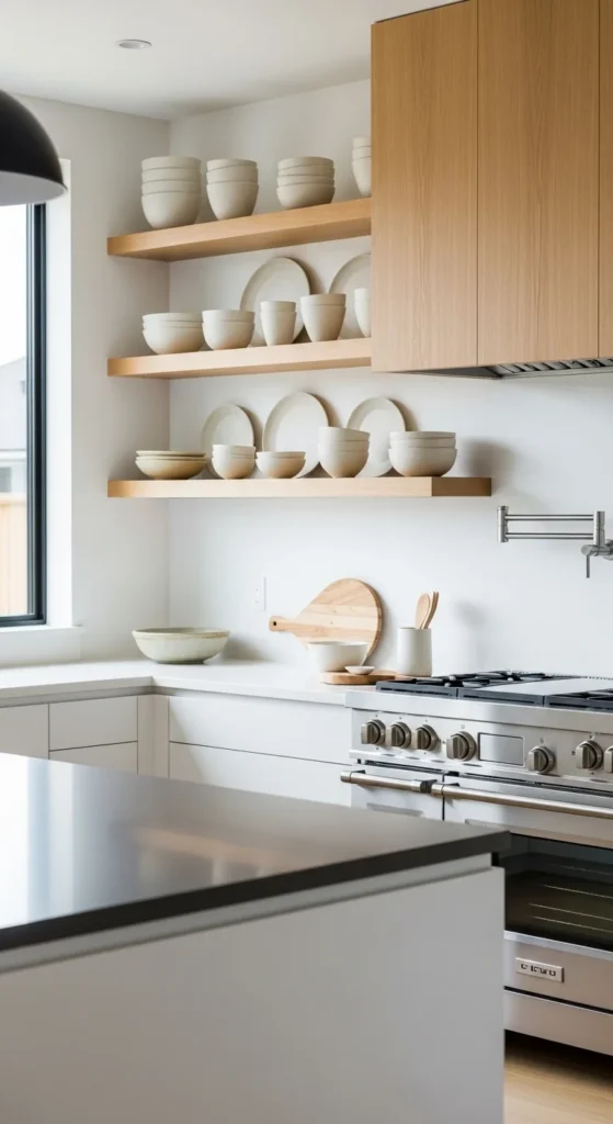 Open shelves work best in small doses. One or two shelves add interest without constant dusting. Keep items neutral and evenly spaced. Avoid overcrowding.