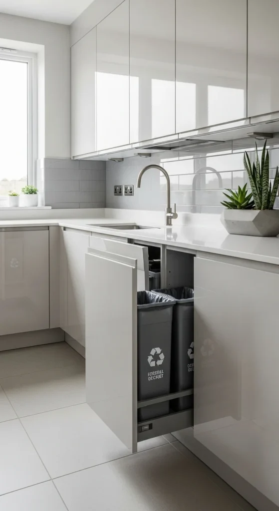 Hidden waste systems keep kitchens tidy. Pull-out bins fit inside base cabinets. This upgrade improves daily use without visible changes.