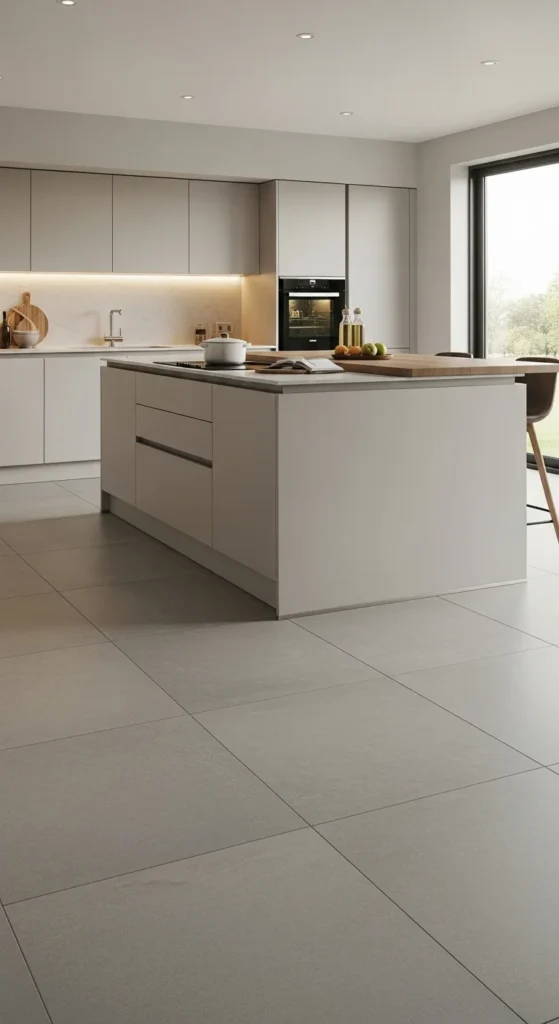 Gray floors pair well with neutral kitchens. Vinyl planks or tile options keep costs lower. Choose matte finishes to avoid glare.