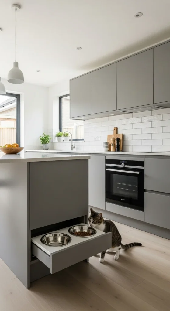 Pet zones keep bowls off walkways. Built-in drawers or low cabinets work well. Simple materials help the area blend in.