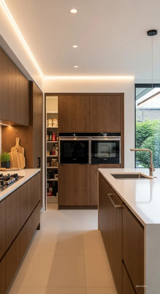 Sliding pantry doors hide storage without taking space. Use panels that match walls. This keeps the kitchen looking calm.