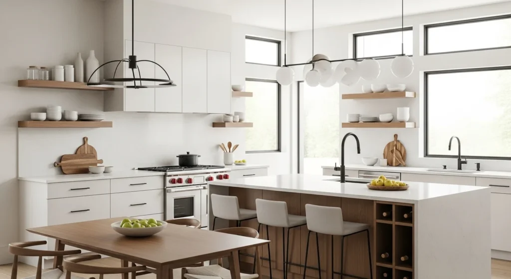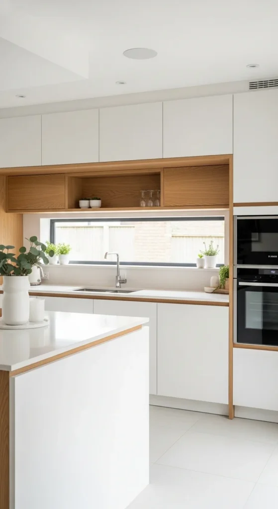 Wood softens modern kitchens. White oak is popular because it feels light and natural. You can add wood through cutting boards, floating shelves, or stool seats instead of cabinets. Even small wood details break up solid surfaces. Choose pieces with simple grain patterns. Avoid heavy stains that feel dated. Keeping wood tones consistent helps the kitchen feel planned rather than mixed.