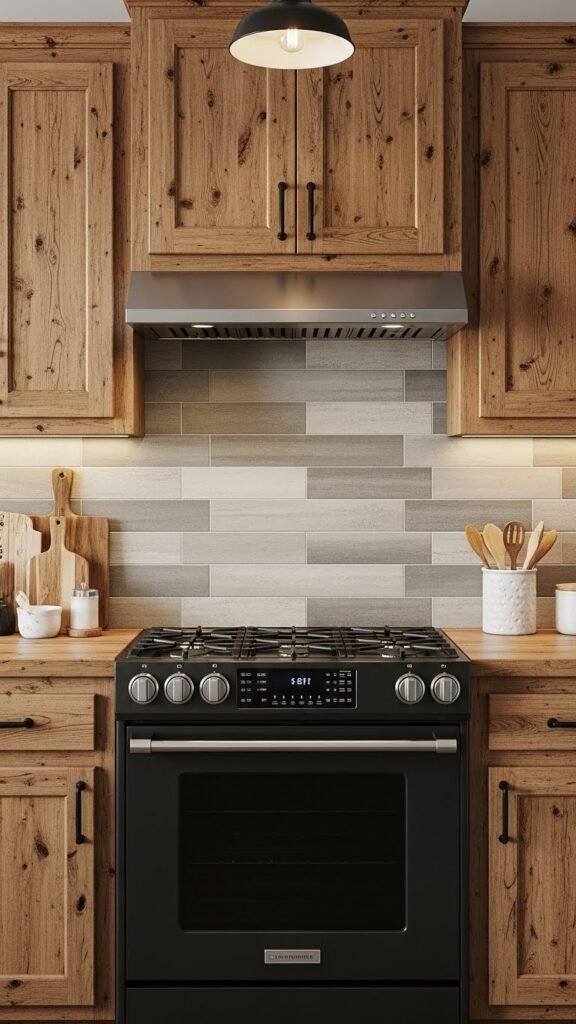 Industrial lights add structure to rustic kitchens. Black or aged metal works best with wood cabinetry. Use warm bulbs to soften the look and avoid harsh shadows over prep areas.