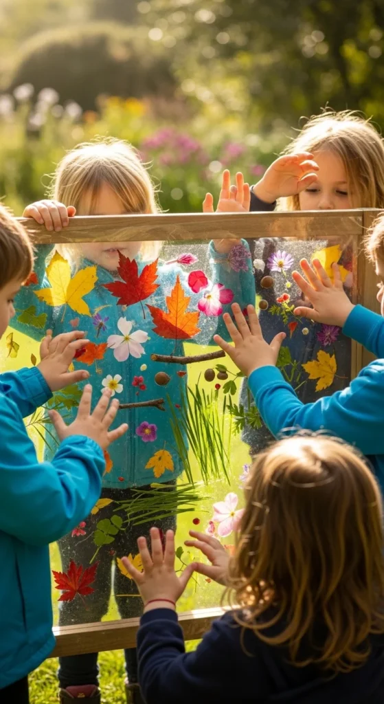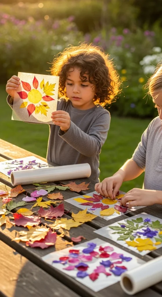 A sticky nature wall is perfect for toddlers and younger children because it is simple, sensory, and very open-ended. Tape a sheet of clear contact paper to a wall, fence, easel, or cardboard board with the sticky side facing out. Then let kids press leaves, petals, grasses, feathers, and tiny flat natural items onto it however they want. This works well because there is no right or wrong way to do it. Children can make pictures, patterns, or just enjoy the feeling of sticking things down. It is also a lower-mess option than paint, which makes it useful for outdoor playdates or quick backyard activities. A budget-friendly tip is to use one large sheet for several kids at once so they can work side by side. If materials are limited, turn the gathering stage into a scavenger hunt first. This craft is especially helpful for short attention spans because kids can join in for a few minutes, leave, and come back later. The final sticky collage often looks bright and textured, and the process feels just as fun as the result.