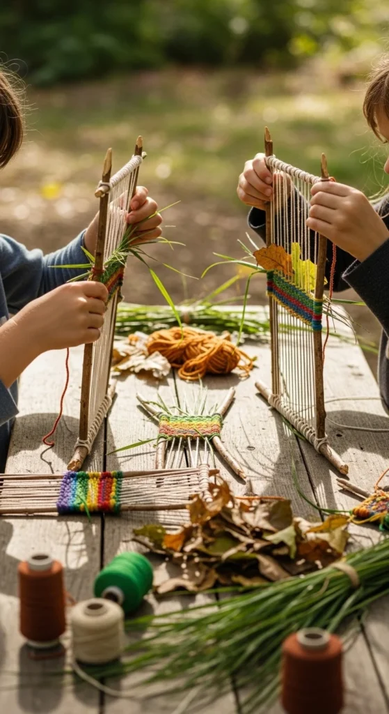 Stick weaving is a lovely nature craft because it turns a few twigs and some string into a little outdoor loom. Find two forked sticks or make a square frame from four small twigs tied together. Then stretch yarn or string across the frame and let kids weave in grass, leaves, petals, feathers, and thin strips of fabric. The result looks textured and colorful without needing many supplies. This is a great project for children who enjoy quiet, focused activities. It also helps with hand control because they have to guide the pieces through the frame carefully. If yarn is not available, soft plant stems or strips of old T-shirt fabric can work too. A good low-cost tip is to collect all the weaving materials in one bowl first so kids can choose textures as they go. The finished weavings can be hung from a branch, displayed indoors, or used as part of another nature collage. This craft feels relaxing and gives children a chance to work slowly while still staying outside.