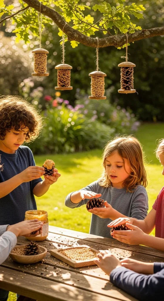 Bird feeders are a classic nature craft because kids get to make something and then watch it attract visitors later. One of the easiest versions uses a pinecone, a spread like peanut butter or seed butter, and birdseed. Tie a string to the pinecone first, spread the coating over it, roll it in seed, and hang it from a tree branch. This project is simple, hands-on, and very satisfying because children can check back later to see if birds found the feeder. If peanut butter is not a good option, use another safe spread or make a feeder from fruit halves, recycled cups, or cardboard tubes. A budget-friendly tip is to use pinecones already fallen in the yard instead of buying anything special. This craft works especially well in colder months when birds are easier to spot, but it can be done year-round. It is a nice mix of art and care for wildlife. Kids often enjoy choosing the hanging spot almost as much as making the feeder itself. It helps them see that a small handmade project can have a real purpose outdoors.