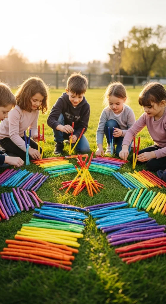 Rainbow sticks turn simple twigs into a colorful sorting and display project. Collect sturdy sticks, then wrap them with colored tape, yarn, fabric scraps, or washable paint. Once dry, kids can arrange them in rainbow order, use them as garden markers, or build little color sculptures on the ground. This is a strong choice when children enjoy bright color but you still want the craft to stay rooted in outdoor materials. It is also a good way to use leftover craft supplies that are already at home. A budget-friendly version uses only markers, scraps of ribbon, or even strips of paper tied around the sticks. Kids can also match collected flowers or leaves to the stick colors as part of a color hunt. This adds a playful learning piece without making the activity feel like schoolwork. Rainbow sticks look cheerful in a flower pot, along a garden path, or tucked into the soil of a play area. The craft is easy, flexible, and especially good for younger kids who like sorting, matching, and arranging things by color.