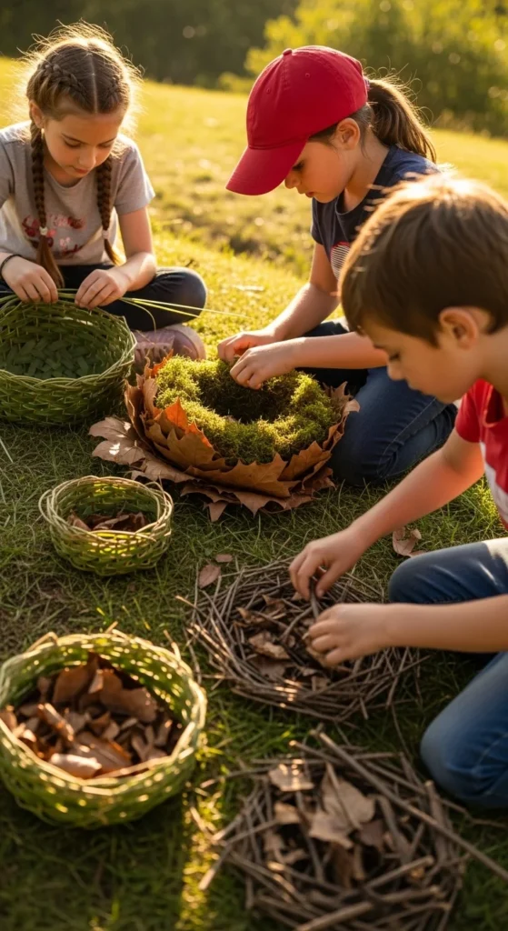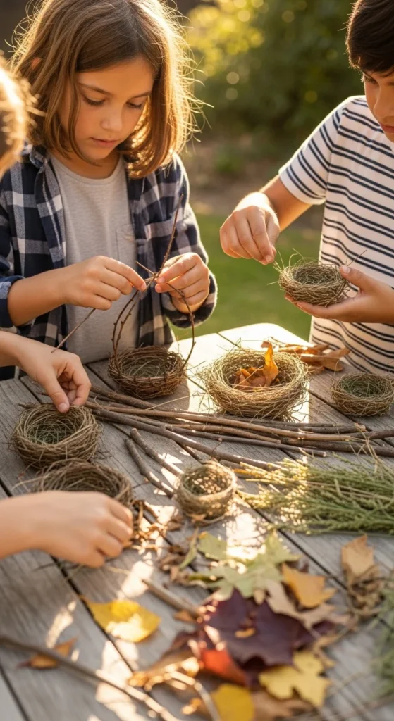 Mini nests are a wonderful craft because they turn loose natural materials into something children instantly recognize. Gather dry grass, flexible twigs, leaves, moss, and a few seed pods, then encourage kids to shape them into small nest forms using their hands or a bowl mold as a guide. The point is not to make a perfect nest. It is to experiment with how natural pieces overlap, tangle, and hold together. This project works especially well for kids who enjoy building and arranging. It also connects nicely with bird-watching or spring nature walks. A budget-friendly tip is to let children make the base shape inside a paper bowl or muffin liner if free-form weaving feels too hard. Then they can remove it later or leave it as support. Add a few pretend eggs made from pebbles or clay if you want to extend the play. These nests look sweet in a garden display, on a windowsill, or as part of another nature scene. The craft feels earthy, simple, and full of outdoor texture.