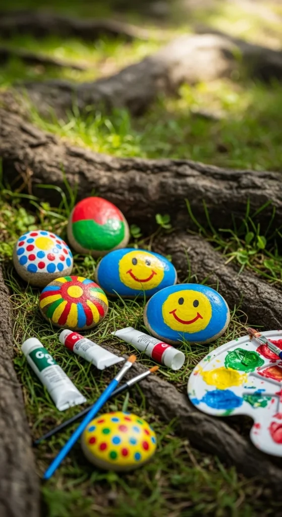 Painted rocks are popular because they are easy to collect, easy to decorate, and easy to turn into a game. Start with smooth stones from the yard, park, or garden border. Wash them, let them dry, and then use washable or acrylic paint to make bright patterns, bugs, flowers, rainbow dots, or smiling faces. Once dry, kids can hide the finished stones around the garden or along a path for someone else to spot later. This project works well for short attention spans because one rock can be finished quickly and still feels complete. If children want more challenge, turn the painted rocks into a themed set like butterflies, weather icons, fruit shapes, or number stones for counting games. A budget-friendly tip is to use old egg cartons as drying trays so the stones stay steady while the paint sets. If paint feels messy outside, give each child a damp cloth and a paper plate palette to make cleanup easier. Kindness stones are especially fun because they mix art with movement. Kids make something by hand, then use it in a hide-and-find game, a garden display, or a small handmade gift for someone else.