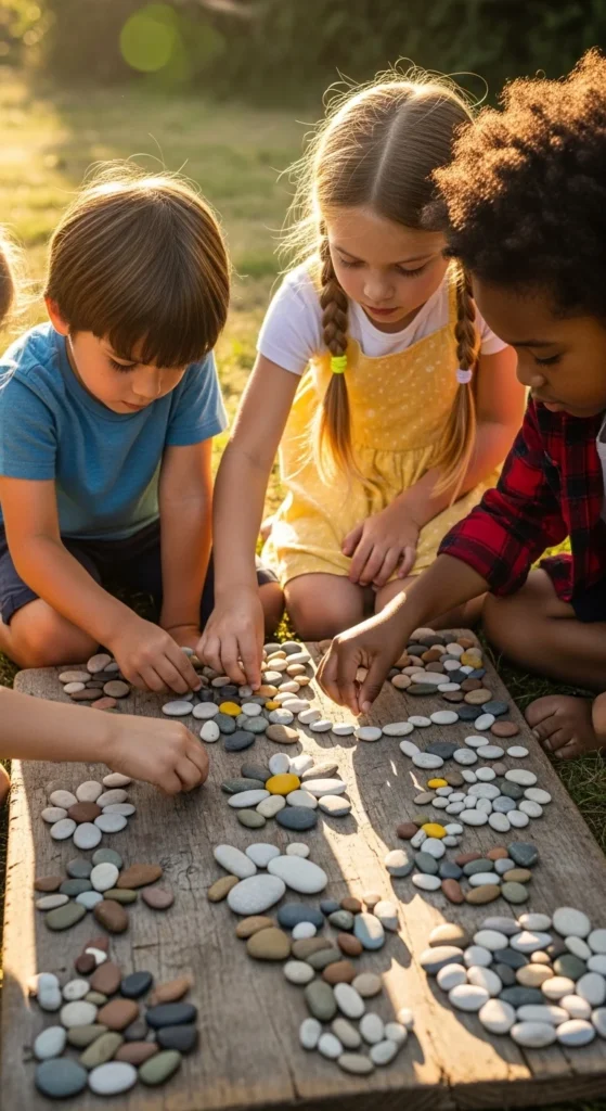 Pebble mosaics are a great outdoor craft because they do not require paint or glue if you want to keep things simple. Kids can collect small stones in different shades and sizes, then arrange them into shapes like hearts, fish, flowers, spirals, initials, or tiny landscapes. They can build the designs on the ground, on a tray, or on cardboard. This project works well because it encourages sorting, pattern-making, and visual planning without creating much mess. If children want a more permanent version, glue the pebbles onto thick cardboard or a scrap wood base once the layout is finished. A budget-friendly tip is to group pebbles by color first. That makes it much easier to build a pattern later. This craft is especially good for kids who like arranging objects carefully and seeing a picture appear piece by piece. Pebble art also pairs well with nature mandalas if you want to expand the activity. It is simple, tactile, and very satisfying once the final image comes together.