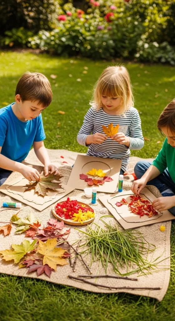 Nature collage frames are a wonderful final project because they combine collecting, arranging, and display in one activity. Start with a cardboard frame cut from a cereal box or old packaging. Then let kids glue leaves, petals, grasses, bark bits, and tiny twigs around the border. The middle can stay open like a real frame, or children can add a drawing, a photo, or a favorite leaf rubbing inside. This craft works well because it feels personal. Each child’s frame ends up looking different based on what they collect and how they arrange it. It is also very low-cost since the base can come from recycled cardboard and the decorations are found outdoors. A helpful tip is to let the natural materials dry a bit first if they are very damp, so they stick more easily. These frames make lovely gifts or seasonal keepsakes, and they can also hold small outdoor art made earlier in the day. It is a great way to turn a collection of nature finds into something that feels finished, decorative, and worth saving.