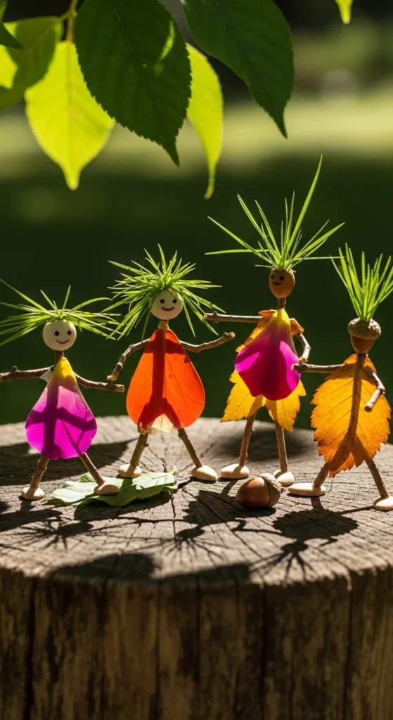 Stick figures made from natural materials are a great craft for kids who like imaginative play. Start by gathering twigs for the body, smaller sticks for arms and legs, and leaves or petals for clothes, wings, or hats. Kids can lay the pieces on the ground first to plan their characters before gluing them onto cardboard, paper, or a scrap wood base. These little “forest folk” can become fairies, explorers, animals, or whole families of nature people. This idea is especially good when children like storytelling because once the figures are finished, they can name them and create little outdoor adventures around them. It is also budget-friendly since the main materials are foraged from the yard or park. A simple homemade glue setup and a tray for collected pieces are usually enough. If you want to avoid glue entirely, make temporary stick people on the ground and photograph them before the wind changes the design. This makes the activity even simpler and fully outdoor-friendly. The craft mixes sorting, arranging, and imaginative thinking, which helps it feel like both an art activity and a game at the same time.