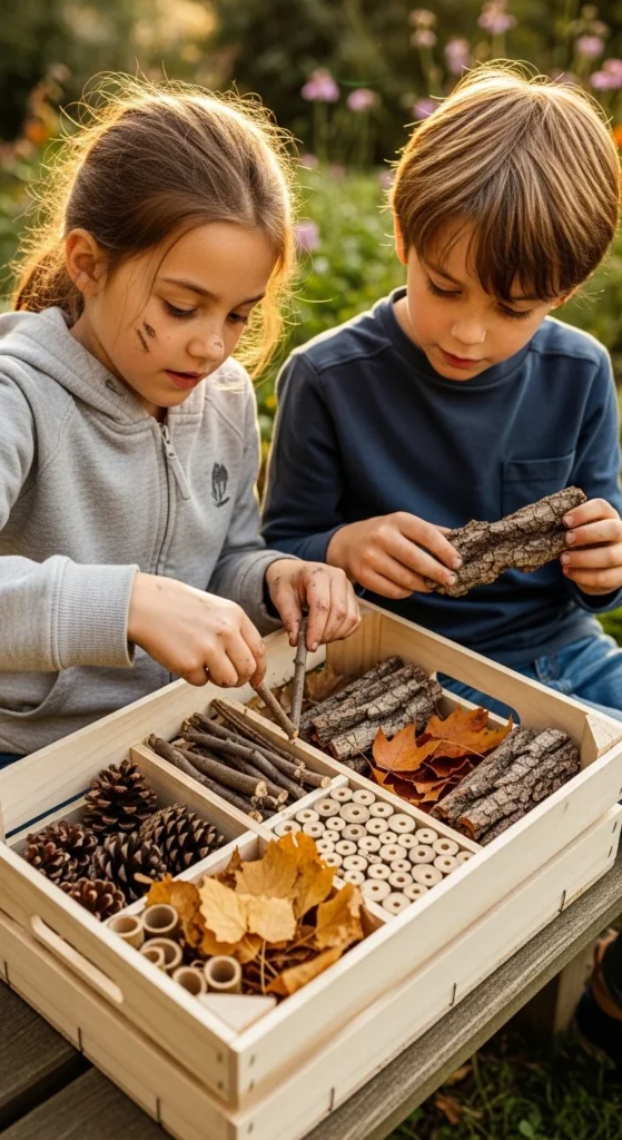 A bug hotel is one of the best nature crafts for kids because it turns collected materials into something useful for the garden. Start with a small wooden crate, box, flower pot on its side, or even a sturdy cardboard container for a temporary version. Then fill it with layers of bark, twigs, dry leaves, pinecones, hollow stems, and bits of straw. Kids can sort the materials by texture or size and pack them into sections like little nature rooms. This project works well because it feels like both crafting and building. Children get the satisfaction of making something while also learning that bugs need places to hide and rest. A helpful budget tip is to use what is already in the yard instead of buying fillers. Fallen branches, dried grass, and old plant stems usually work well. Place the finished bug hotel in a quiet garden corner and check it later to see if tiny creatures have visited. This is a great craft for older kids who enjoy building, but younger children can help collect and sort the materials too. It gives outdoor creativity a real purpose and keeps the nature theme going long after the craft session ends.