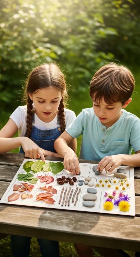 A scavenger board turns nature collecting into a craft and a game at the same time. Start with a sheet of cardboard, paper, or a simple tray and create sections for things like leaves, pebbles, feathers, pinecones, grass, petals, and bark. Then send kids out to collect one of each item and place them in the correct spot. Once the board is filled, they can glue the pieces down, draw around them, or use the collection as the start of another craft. This is especially good for children who like goals and movement because it gives the outdoor walk a clear purpose. It also works well for mixed ages since younger kids can match shapes and older kids can hunt for specific textures, sizes, or colors. A low-cost tip is to use an old pizza box or cereal box as the base. If you do not want to glue everything, just take a photo of the finished collection board before putting the items back outside. This activity builds observation skills, keeps kids moving, and helps them notice details they might miss on a normal walk.